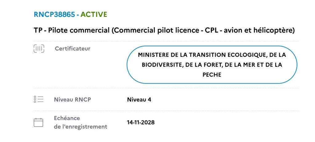 Notre formation : « STAGE CPL-H » (Dernière partie du CPL-H Modulaire; Cf. « Etapes Clés de la formation », étape 3) est certifiée RNCP38865